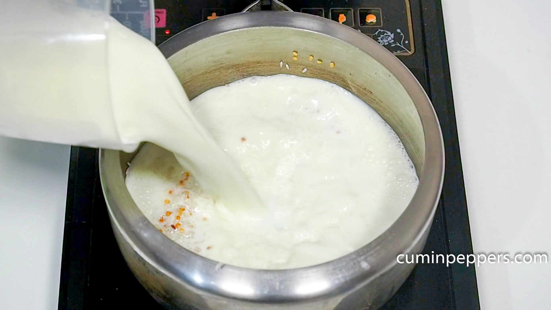 3. Add both rice and dhal into pressure cooker, add 2 1/2 cup of milk into it
