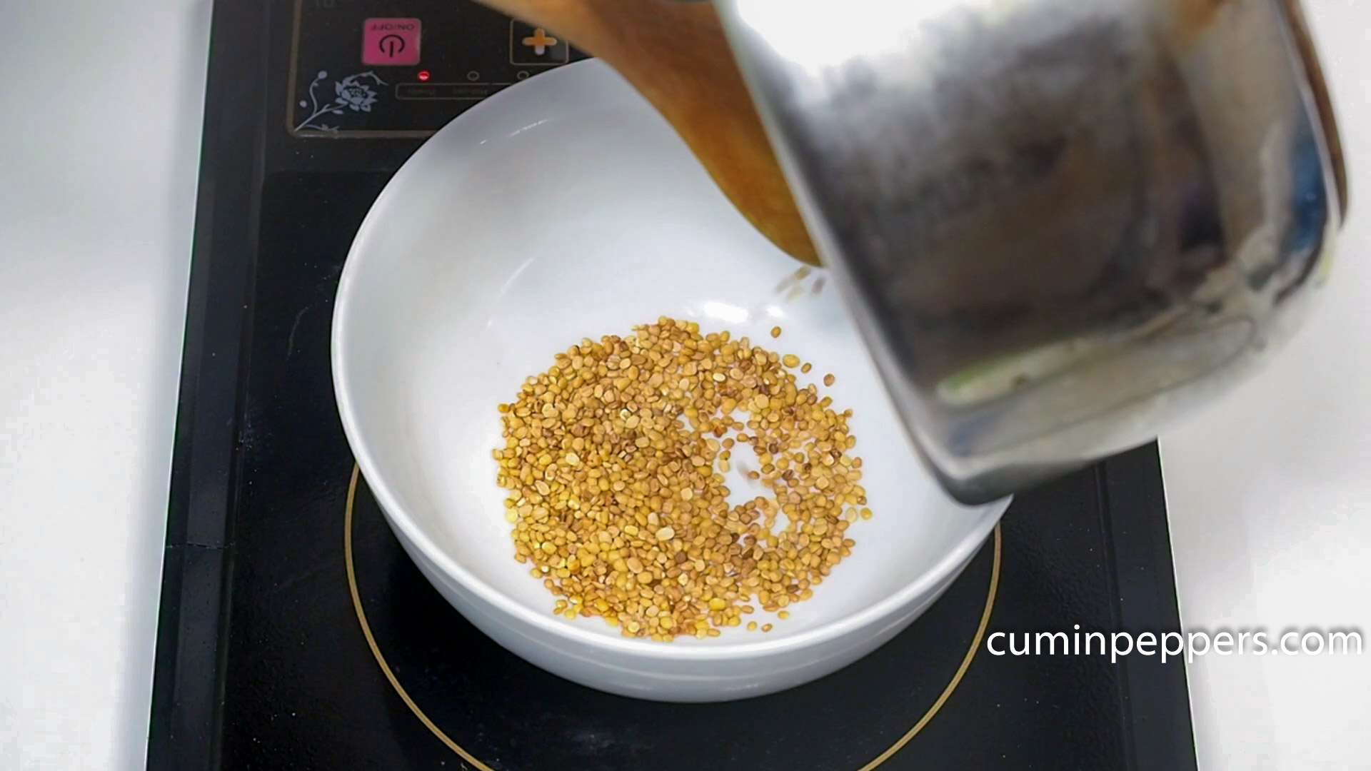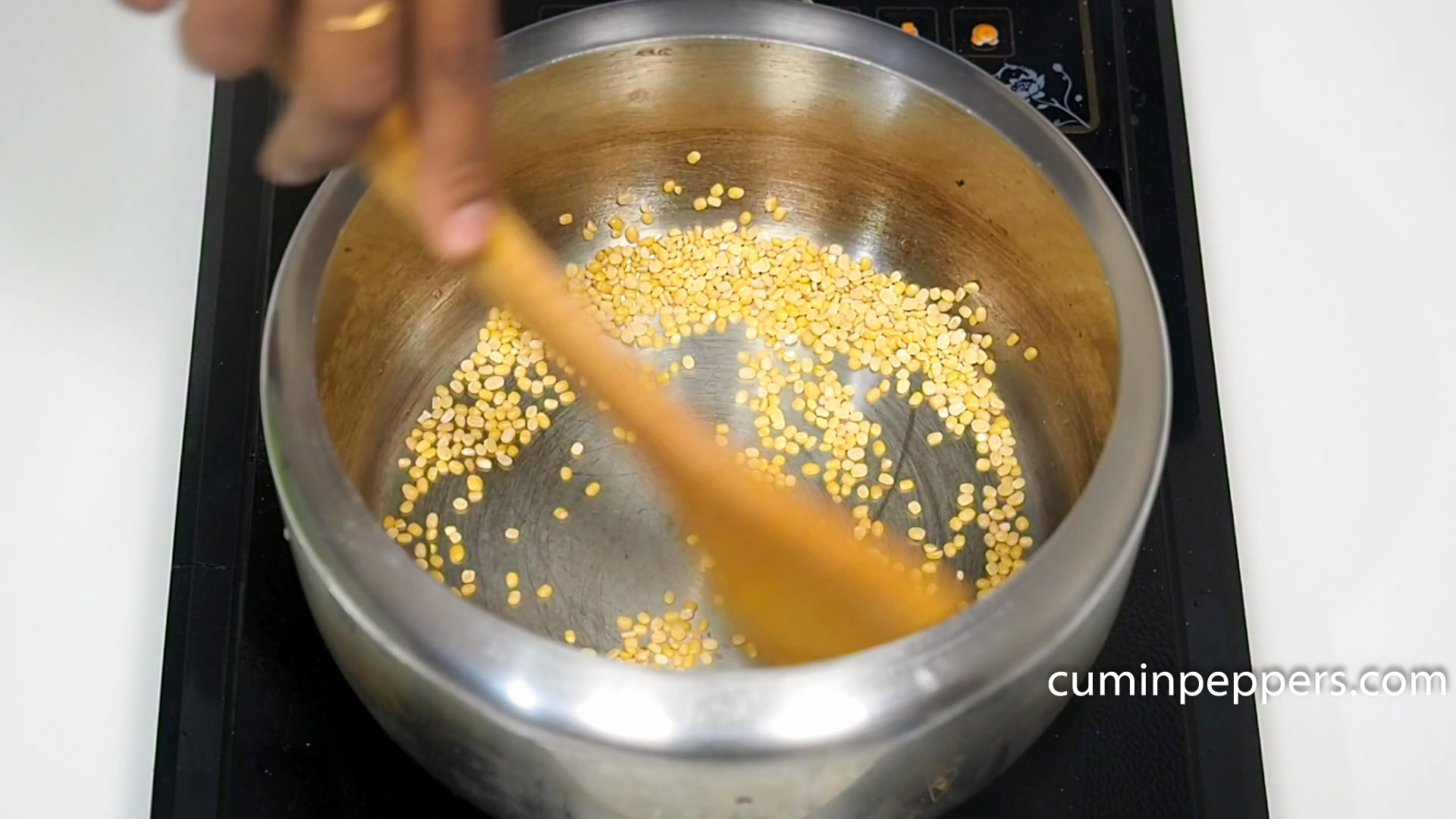 1. In a pressure cooker, add the moong dhal and fry it for 5 minutes till it gets golden color