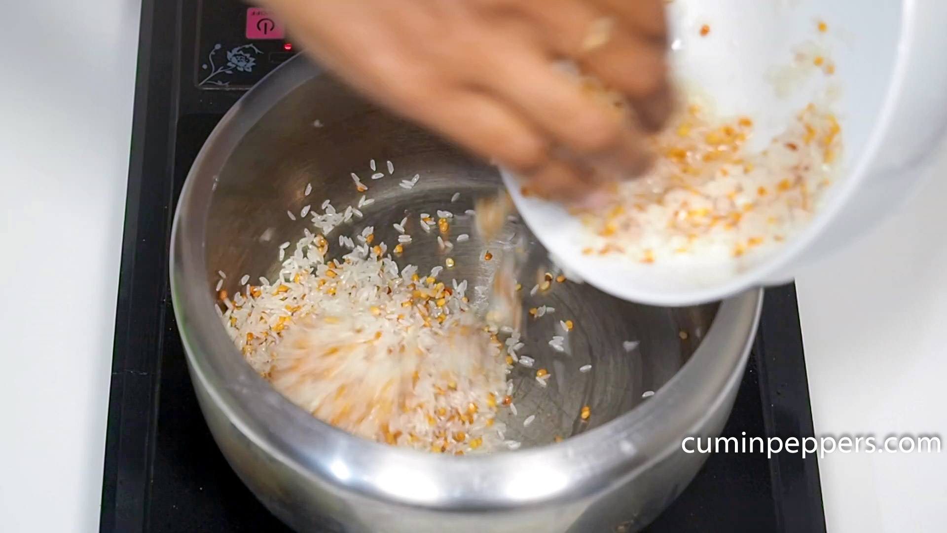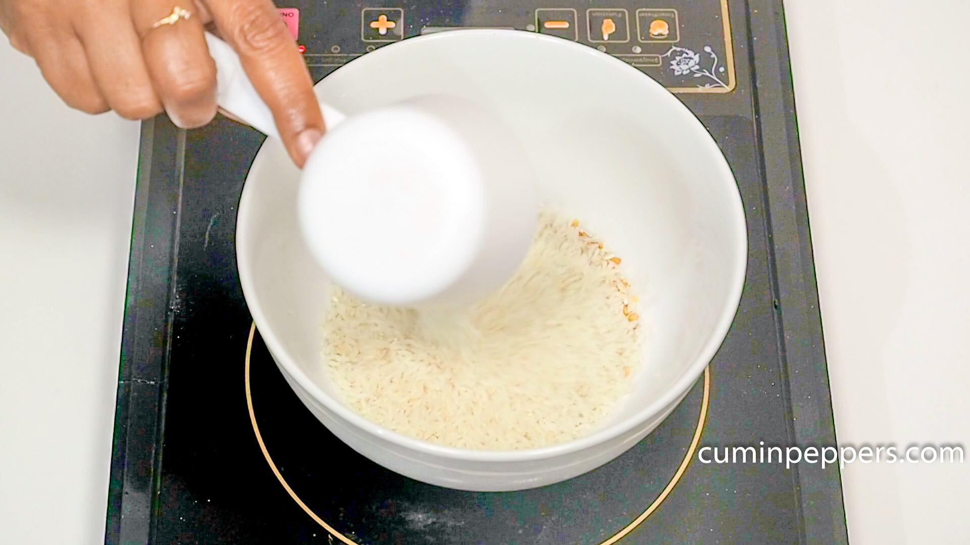 2. Transfer the fried dhal in a bowl, add 1/2 cup raw rice, wash it thoroughly
