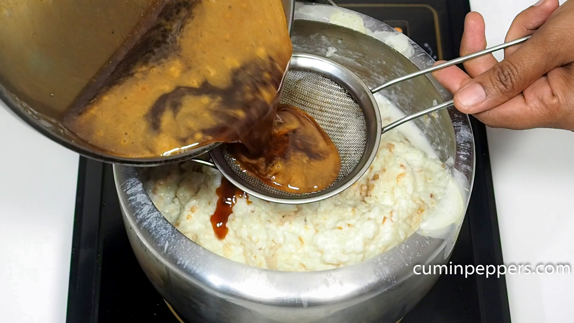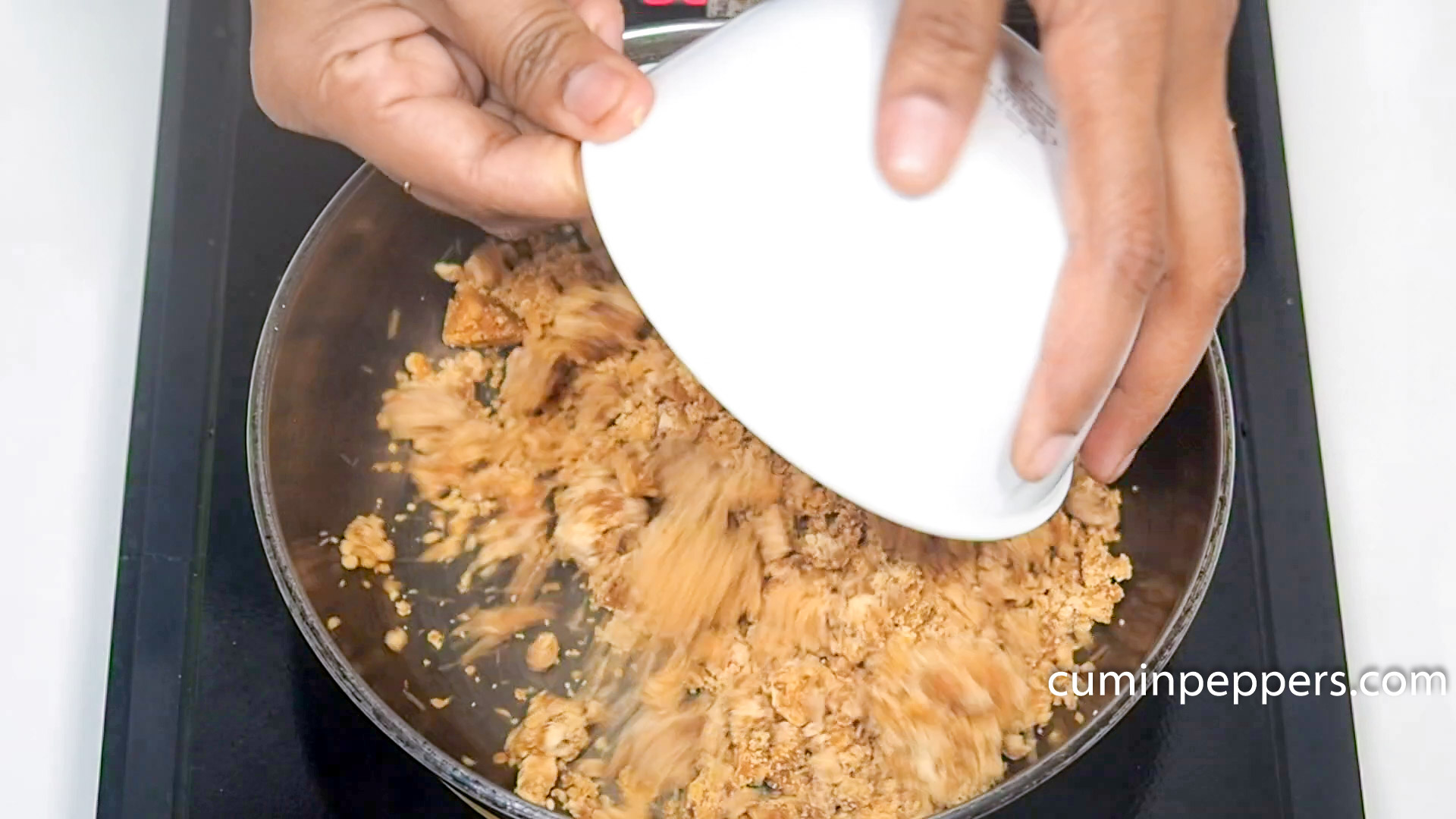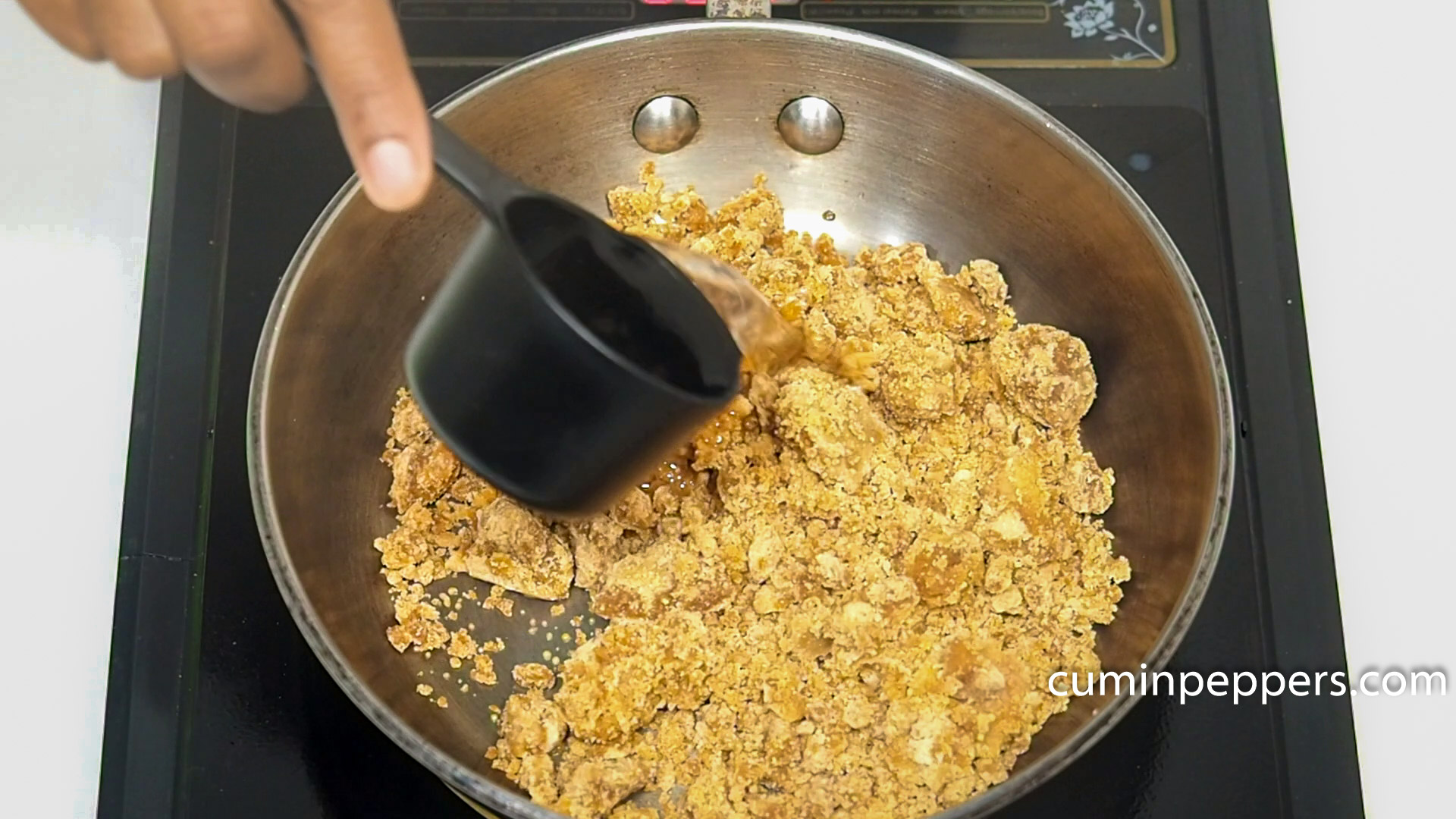 6. Take the jaggery in a pan, add 1/4 cup of water and heat it, mix it to melt, and keep aside