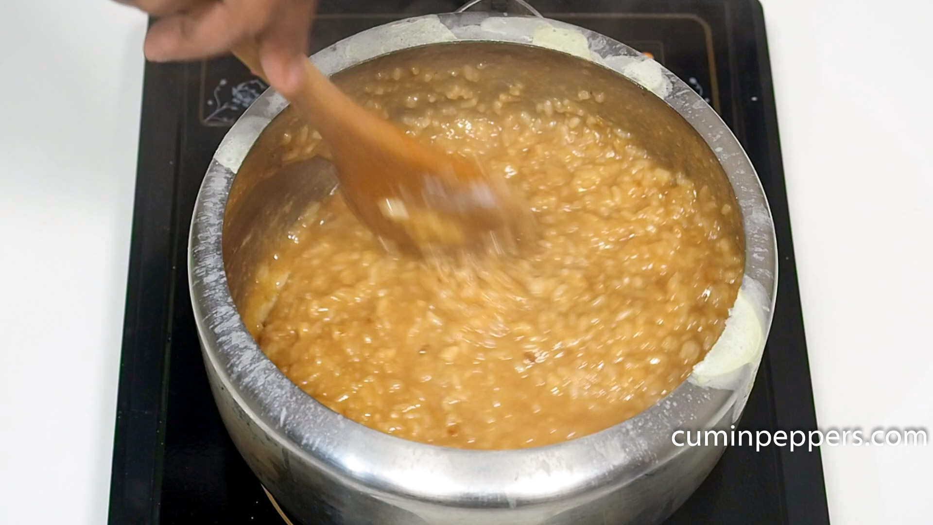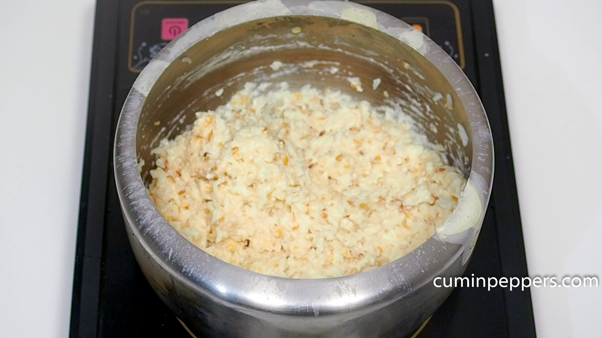 7. Once the pressure releases in the cooker, open the lid and mix well. Mash it with ladle.