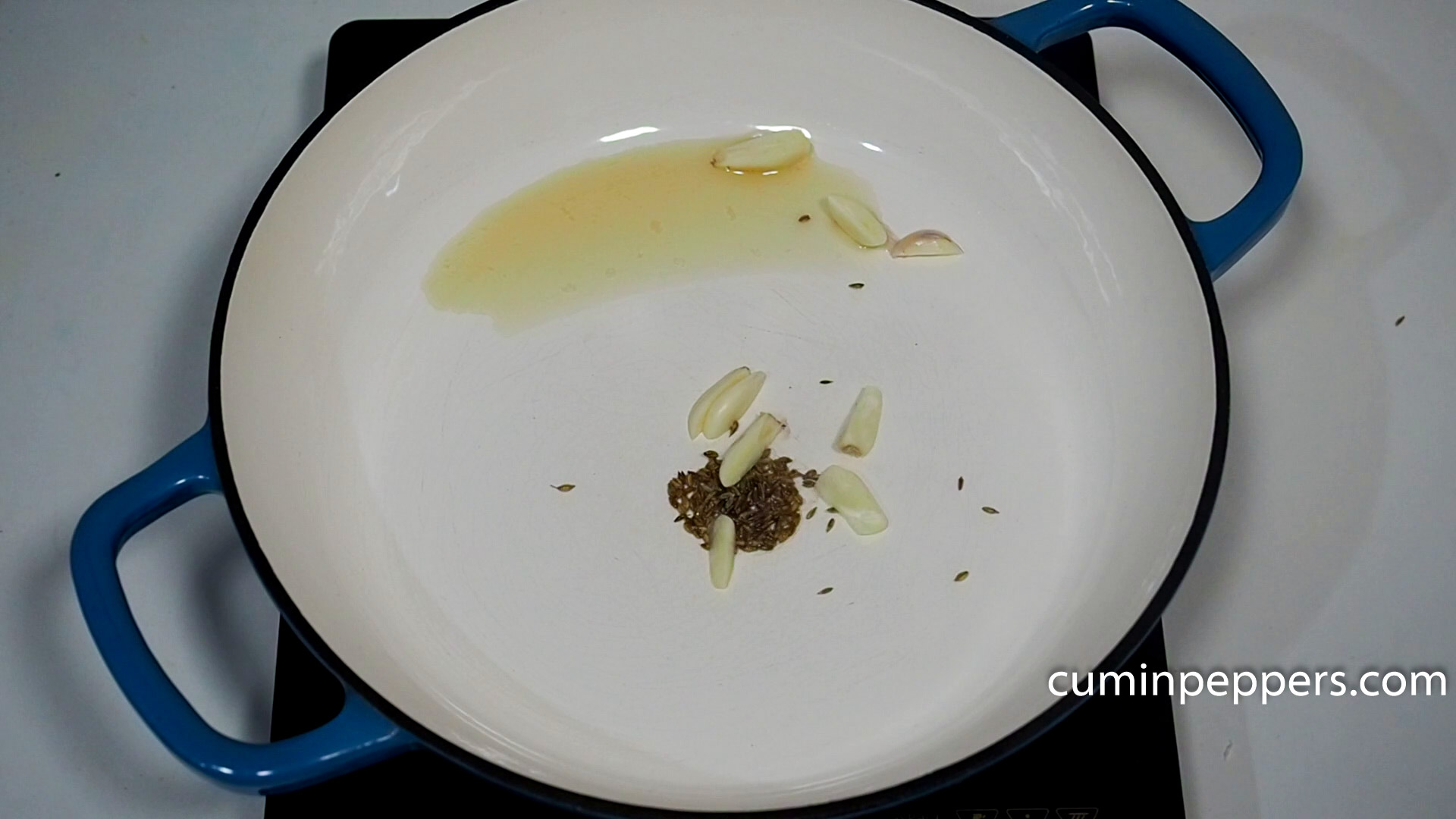 - Heat ½ tbsp of sesame oil, ad cumin, garlic, saute
