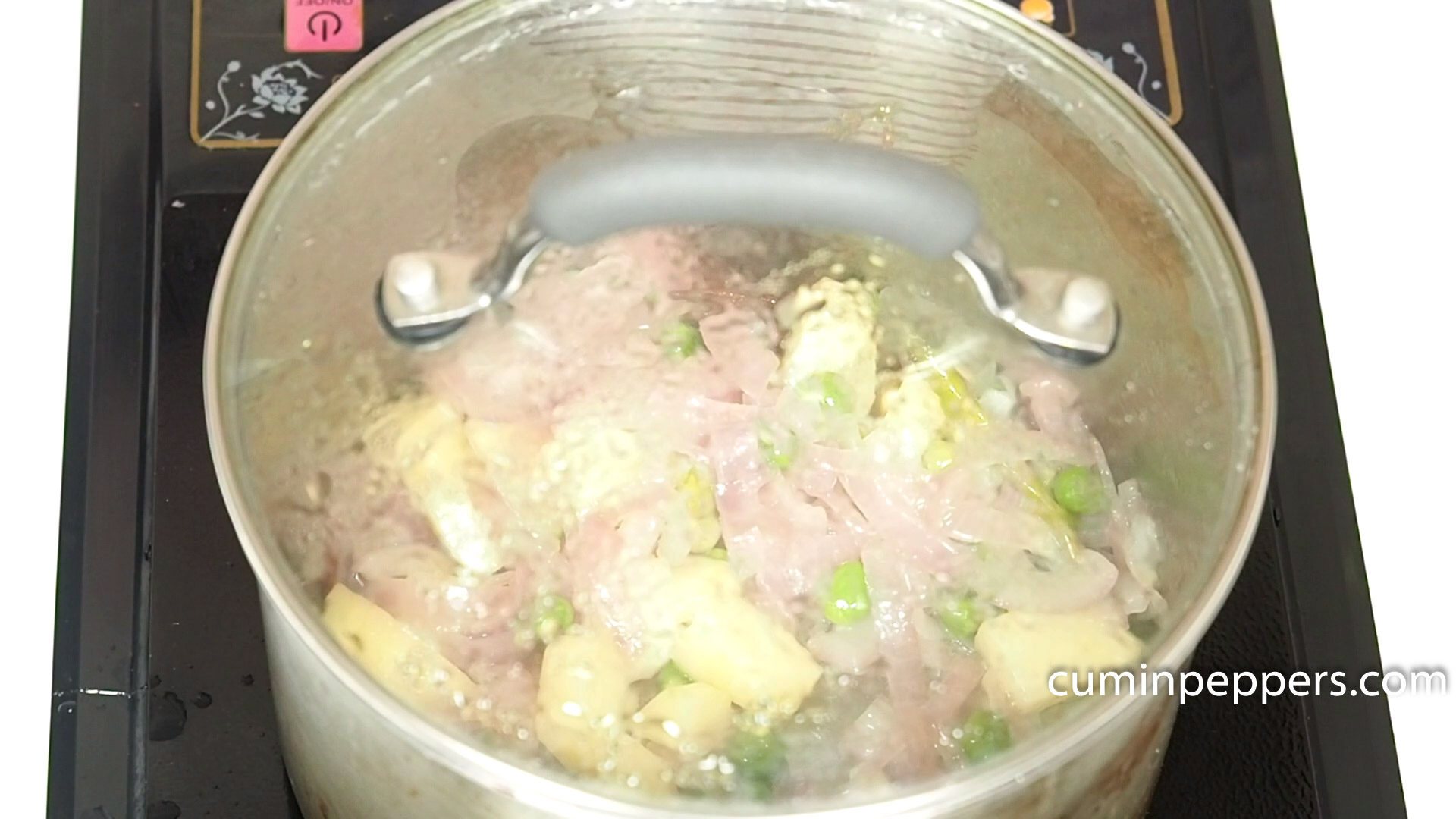 - Add chopped potato and peas, saute well for 5 minutes