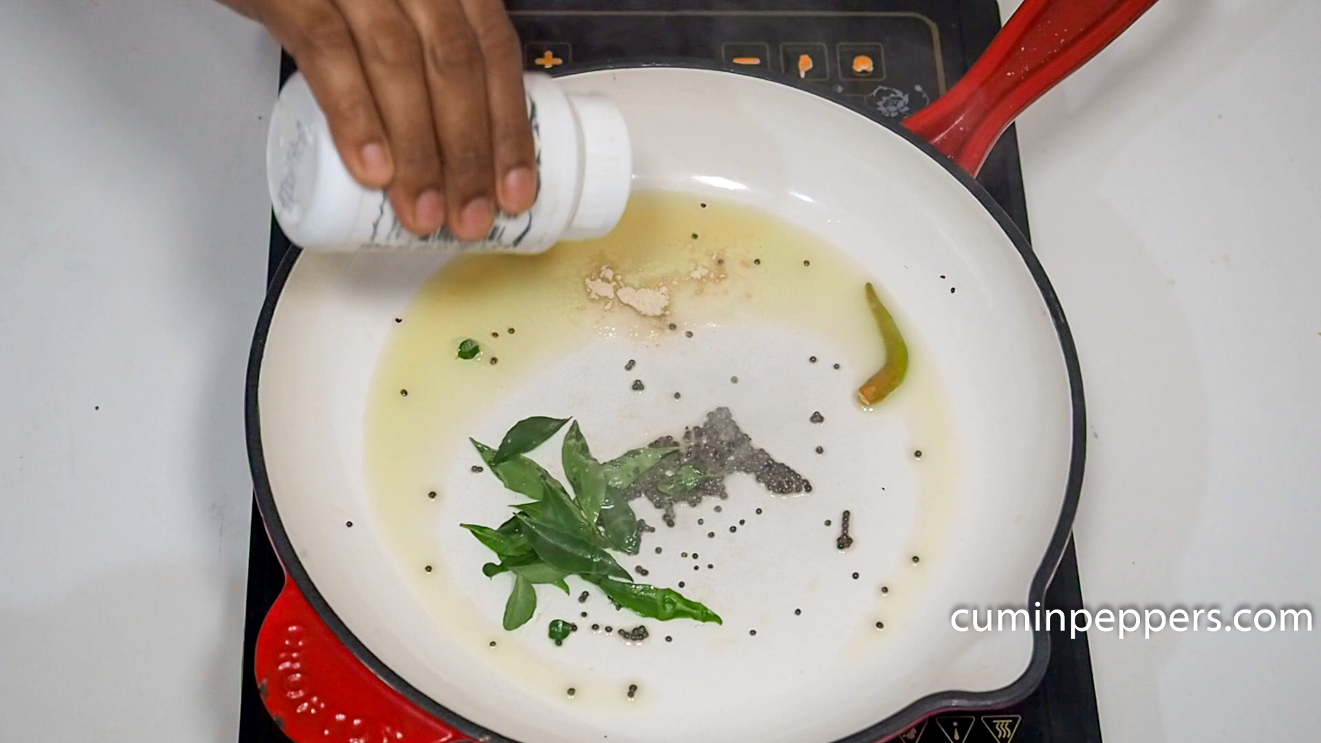 - Heat the oil in pan, splutter mustard seeds. Add curry leaves, green chilly, a pinch of asafoetida
