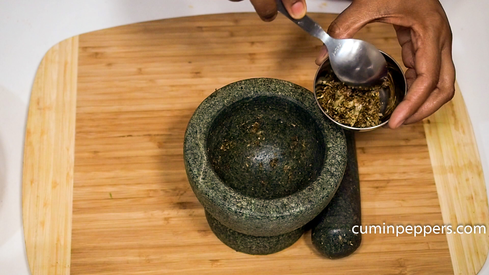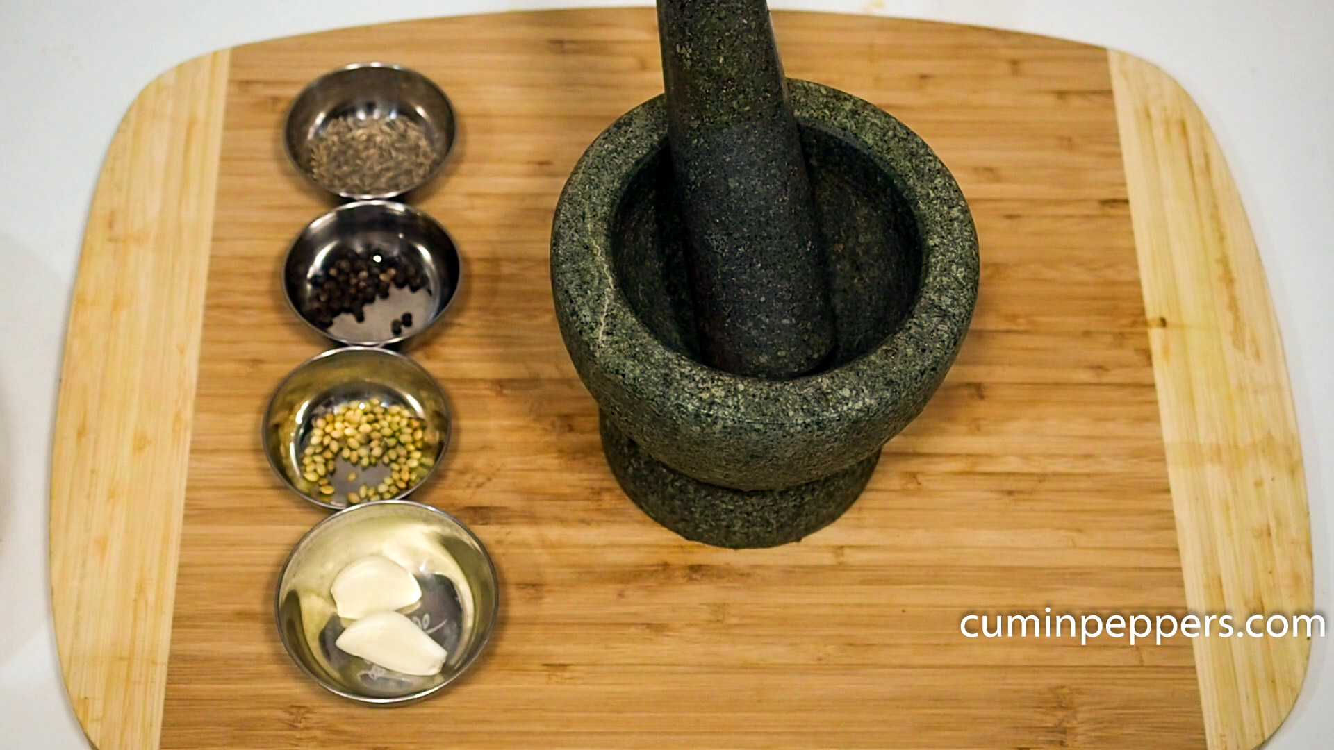 - Add coriander seeds, cumin, black pepper into a mortar, grind it into a coarse powder, then add garlic cloves, crush it with other spices. collect it from the mortar, keep aside
